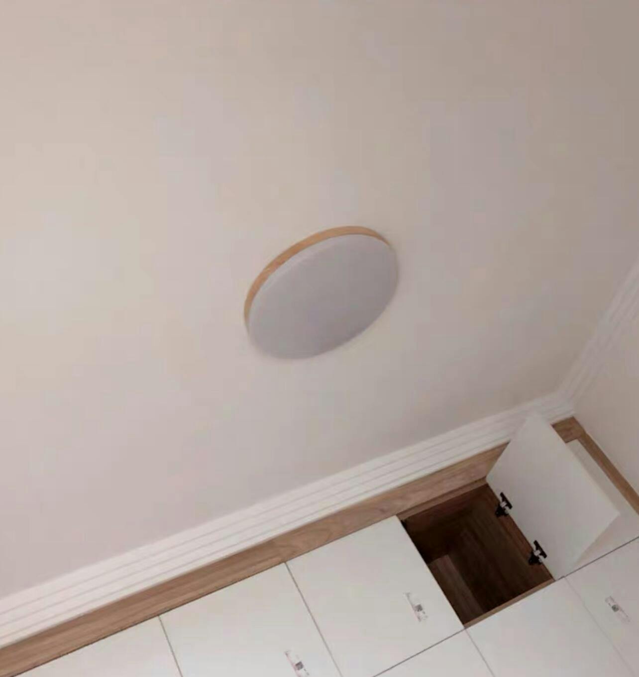 The light is elegantly mounted on a natural wood base, which adds a touch of warmth and organic texture to the otherwise sleek and minimalist aesthetic of the space. The white finish of the ceiling light ensures a bright and inviting atmosphere, illuminating the bathroom with a soft, diffused glow that enhances the overall ambience. This fixture not only serves as a practical source of illumination but also acts as a stylish focal point, complementing the modern decor and creating a serene environment ideal for relaxation and rejuvenation. The combination of the round shape and wood accents makes this ceiling light a perfect choice for those looking to elevate their space's design while maintaining a clean and Scandinavian look