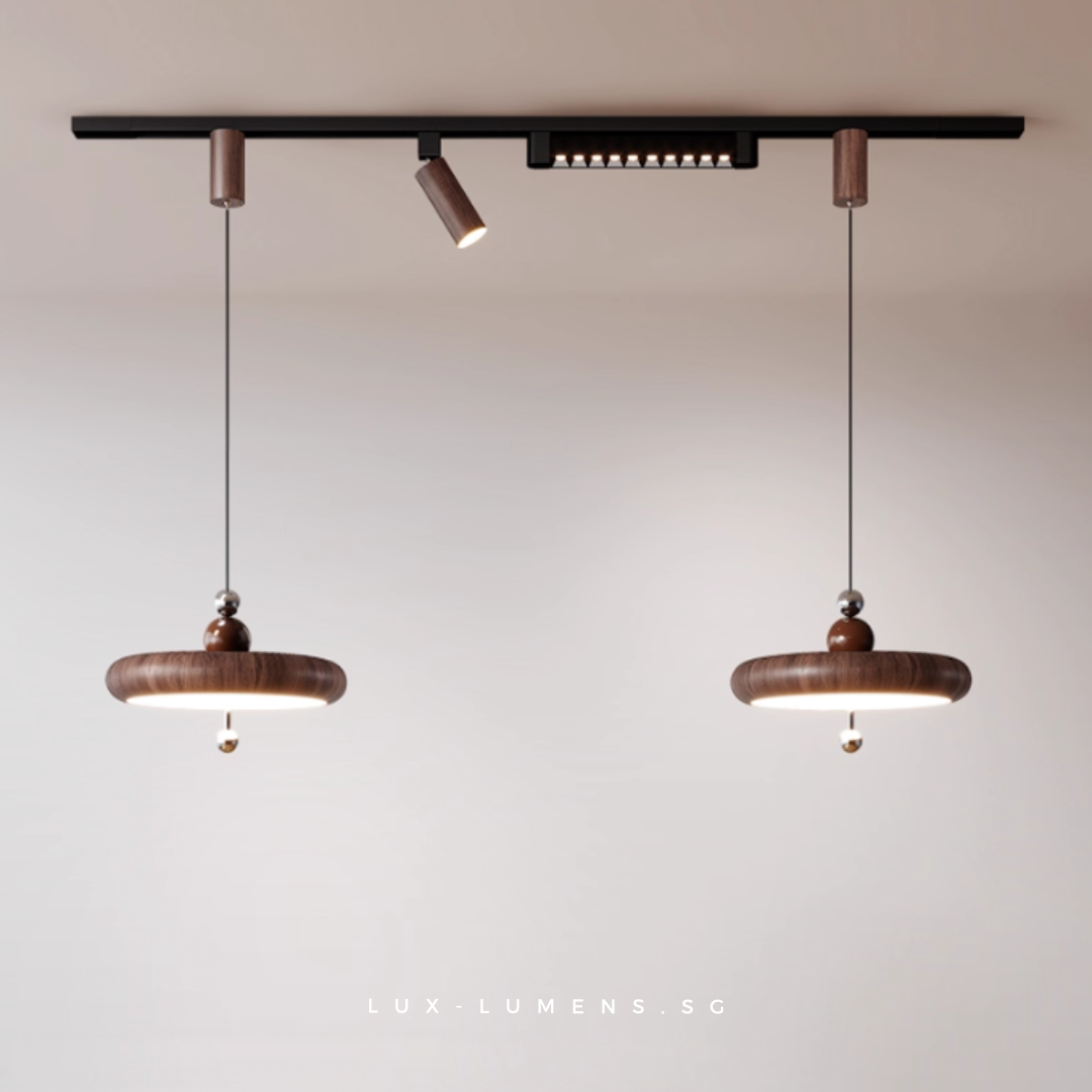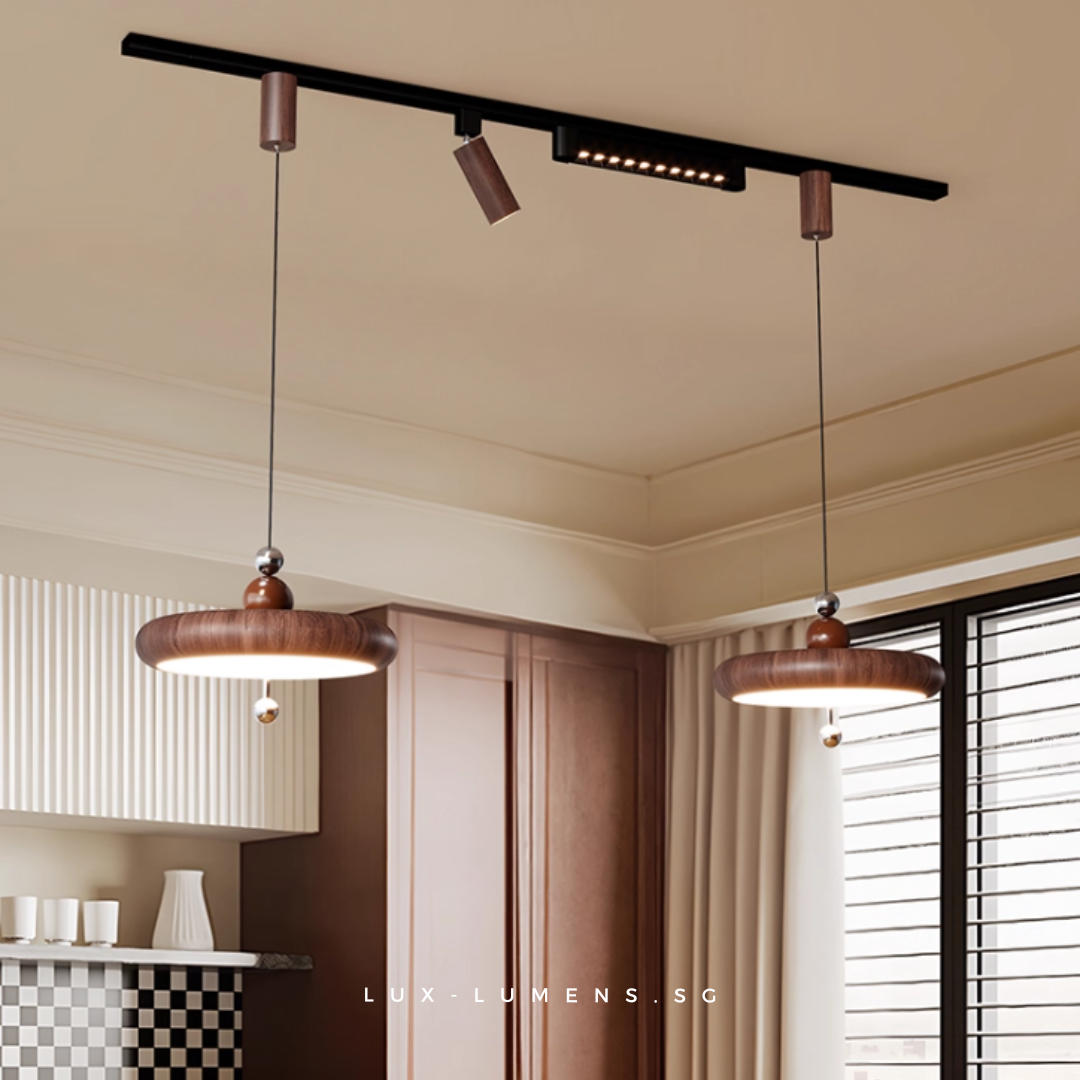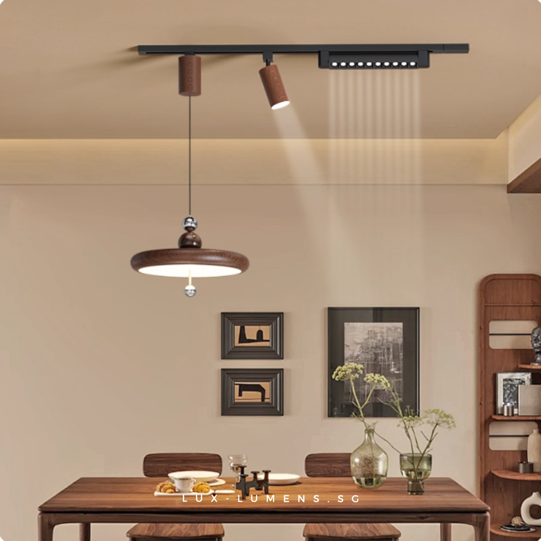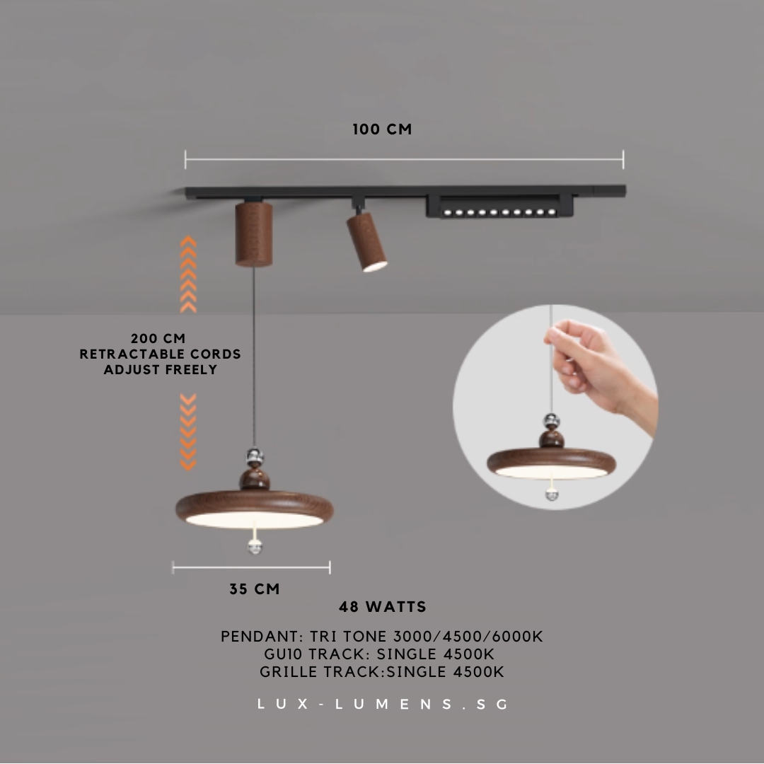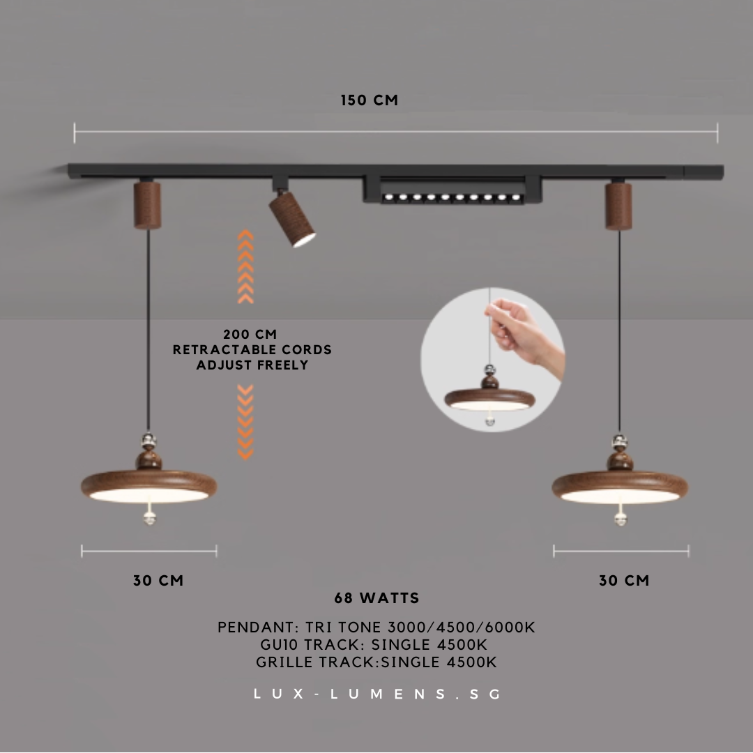 wood finishes (oven-baked for long-lasting effects) bring forth an avant-garde feel to your ambience. Its functional design is designed with the intent to allow the utilization of very popular track lights & pendant lights in today's context, whilst eliminating the need for messy and costly re-wirings/hacking of ceilings.